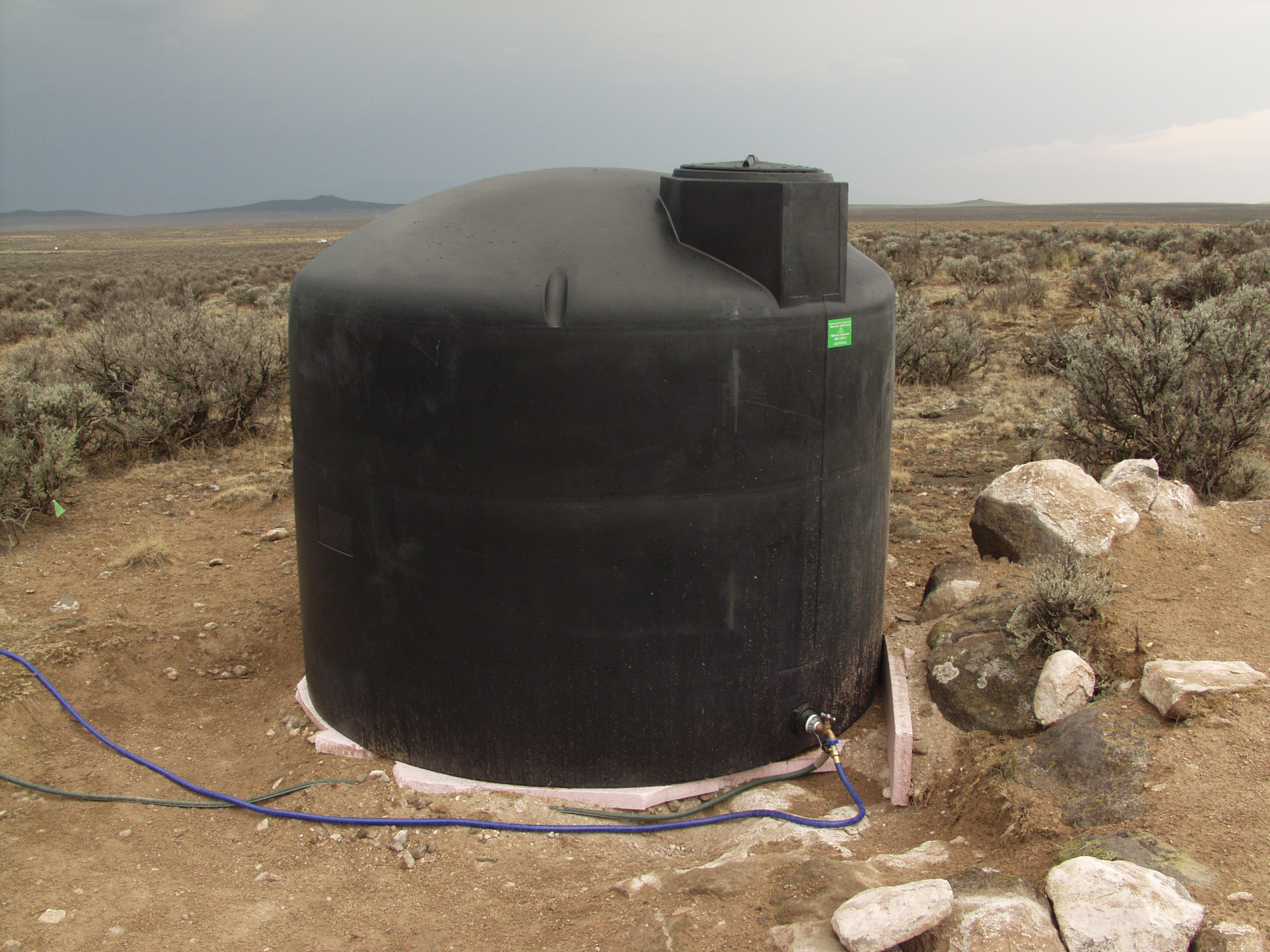 On one of my 60 mile trips down to Espanola to the hardware store, I passed a place that had a new, large black plastic water tank sitting out front with a price written on it and a phone number. I think I got it for about $600, delivered. I leveled a space a little way up the hill from the bathhouse and accessible to my road for filling, and put down a pad of 2 inch insulation foam to set it on. The plan was to eventually build a straw bale shed around it to keep it from freezing and to house the pump and generator. Then I found an ad in the local nickel saver paper for a guy who does water delivery. He had a 2000 gallon tank strapped to the back of his truck which he filled with treated city water, and a gas powered pump with a large hose that moved the water quickly. My tank only holds 1700 gallons but I had to pay the $100 for the whole load anyway.