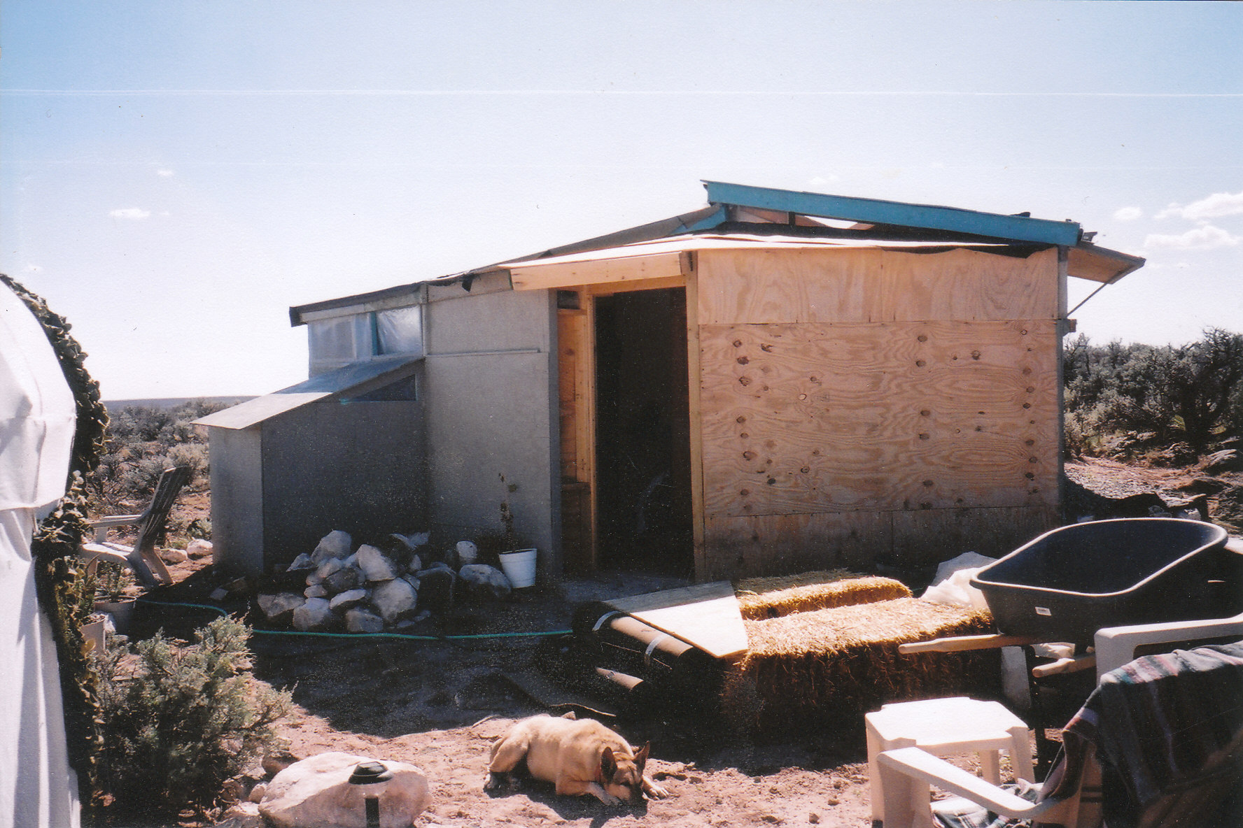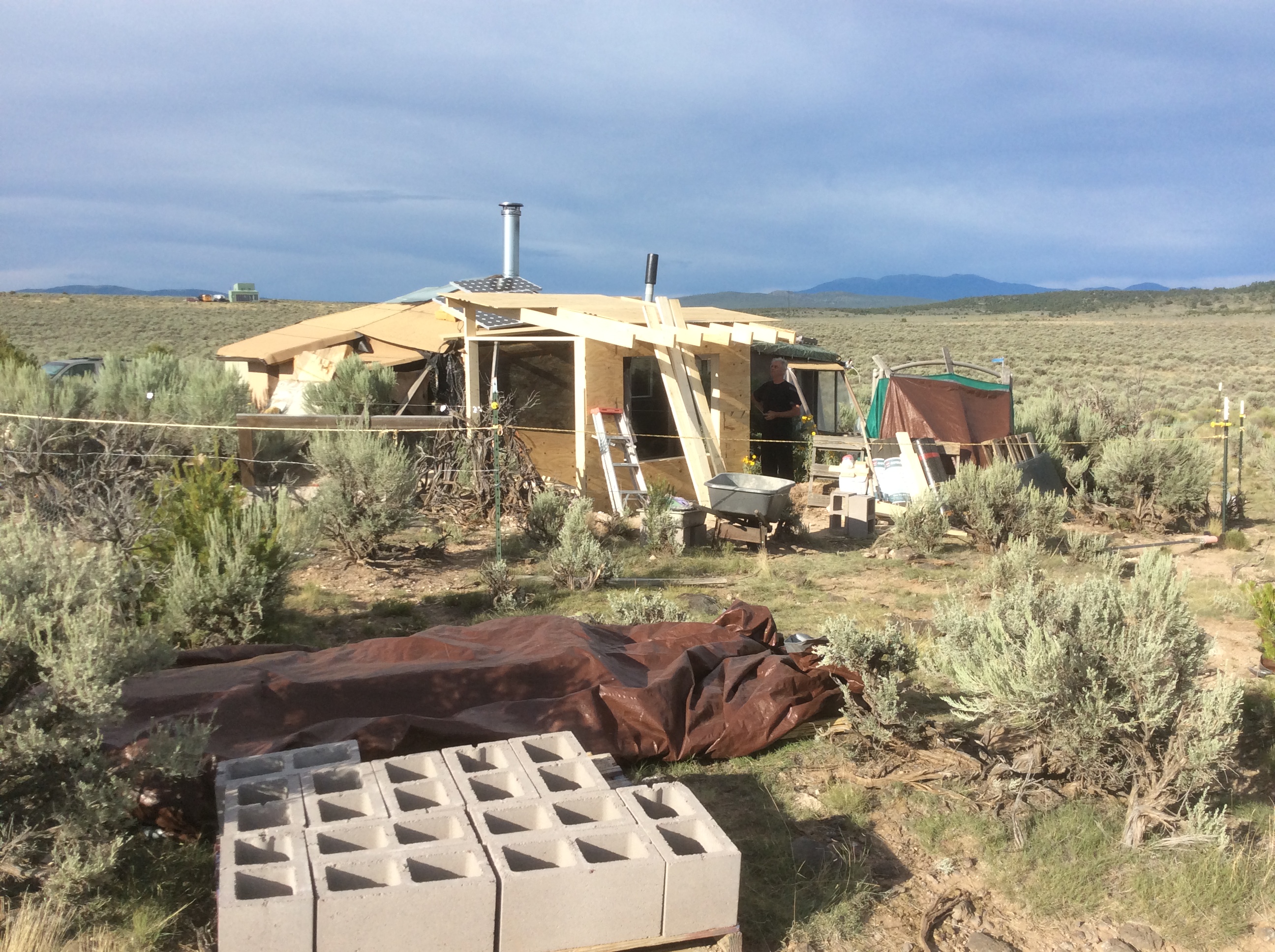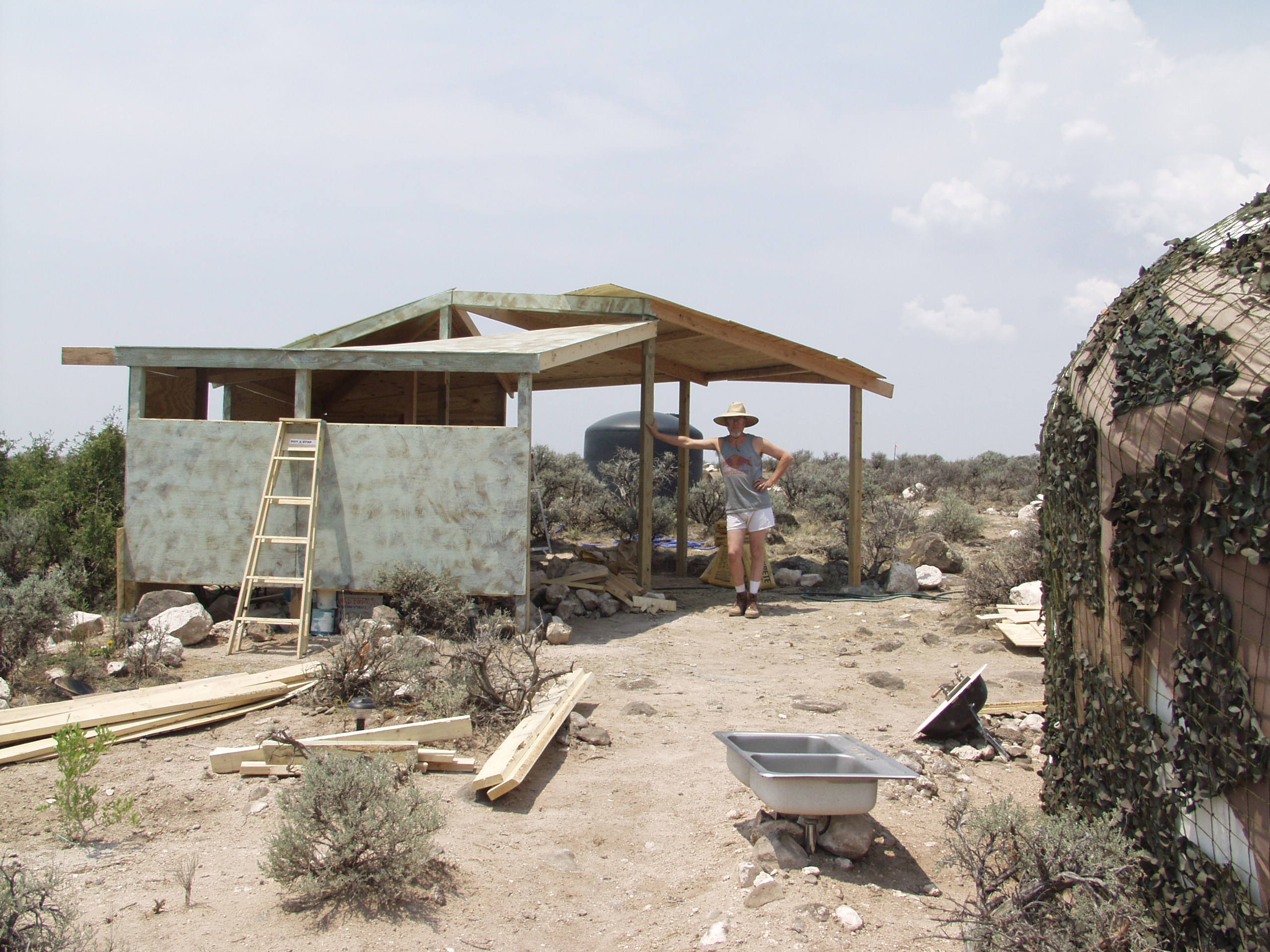 To help diminish the spectacle quality that the place was taking on, what with the white yurt, black tank, and fluttering plastic bale tower, I painted the south, road facing wall a mottled camouflage incorporating the colors of the sage the whole mess rose from. Don’t need any unwanted attention when you don’t even have a door to lock. A later encounter with a local indicated that it made an unexpected impression. When Ken casually mentioned to the storekeeper that he was helping a friend build his place a few miles down the road, the guy kind of blinked, eyes widening, assessing us differently, and said,