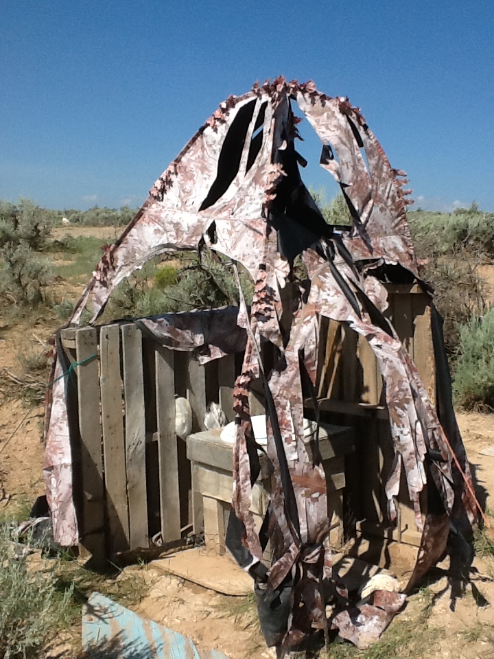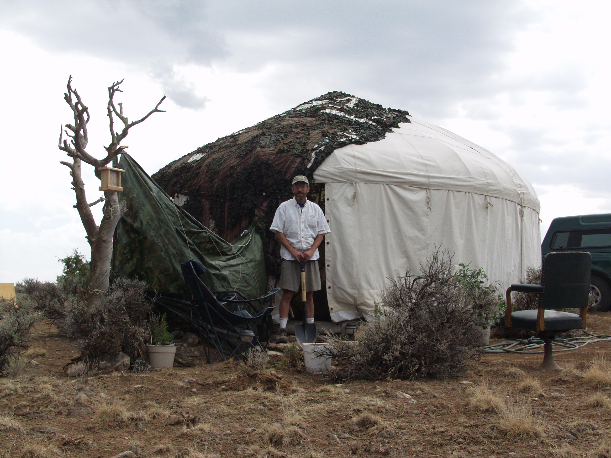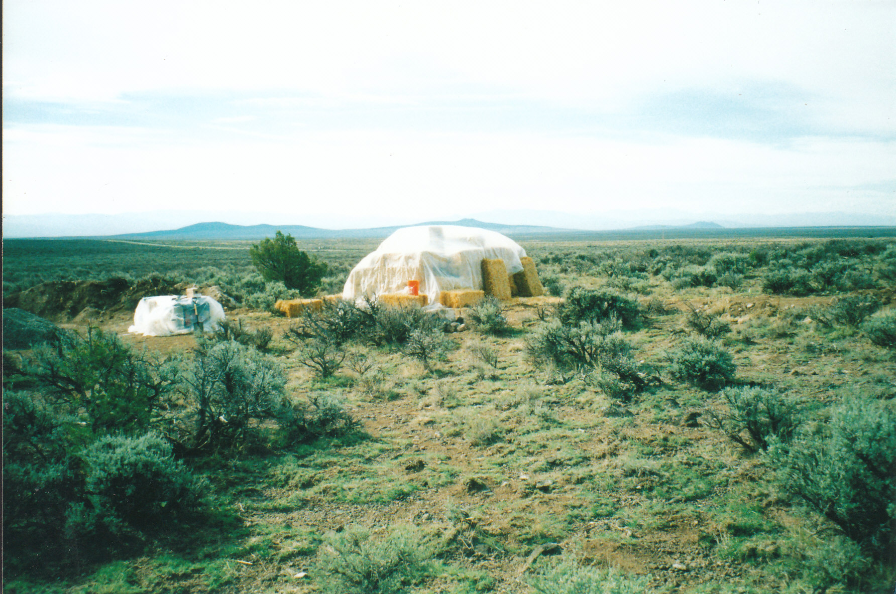 To help diminish the spectacle quality that the place was taking on, what with the white yurt, black tank, and fluttering plastic bale tower, I painted the south, road facing wall a mottled camouflage incorporating the colors of the sage the whole mess rose from. Don’t need any unwanted attention when you don’t even have a door to lock. A later encounter with a local indicated that it made an unexpected impression. When Ken casually mentioned to the storekeeper that he was helping a friend build his place a few miles down the road, the guy kind of blinked, eyes widening, assessing us differently, and said,