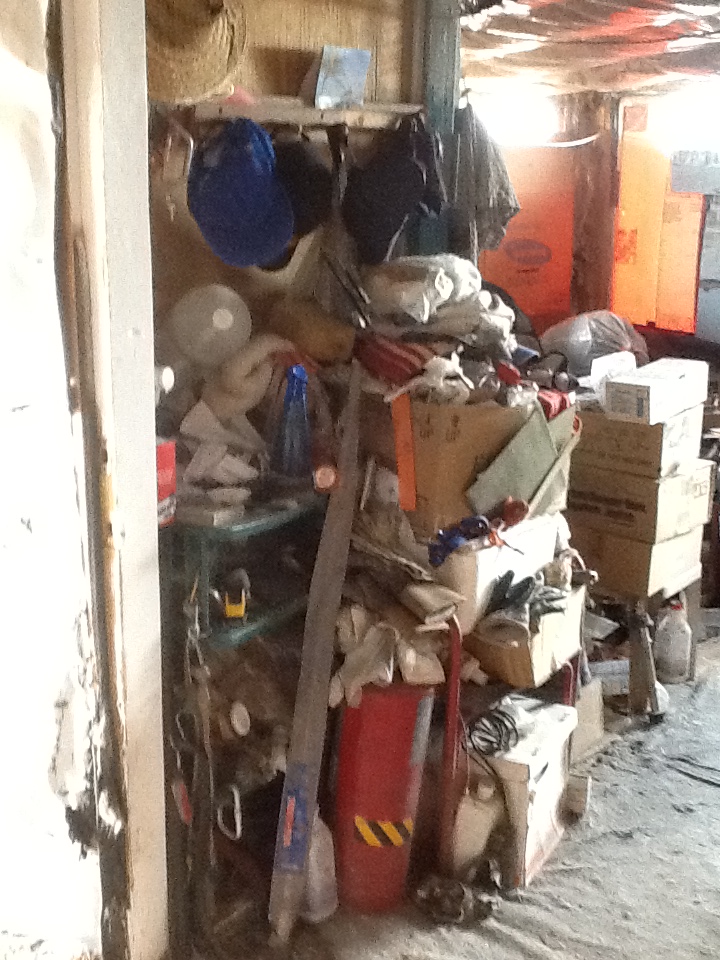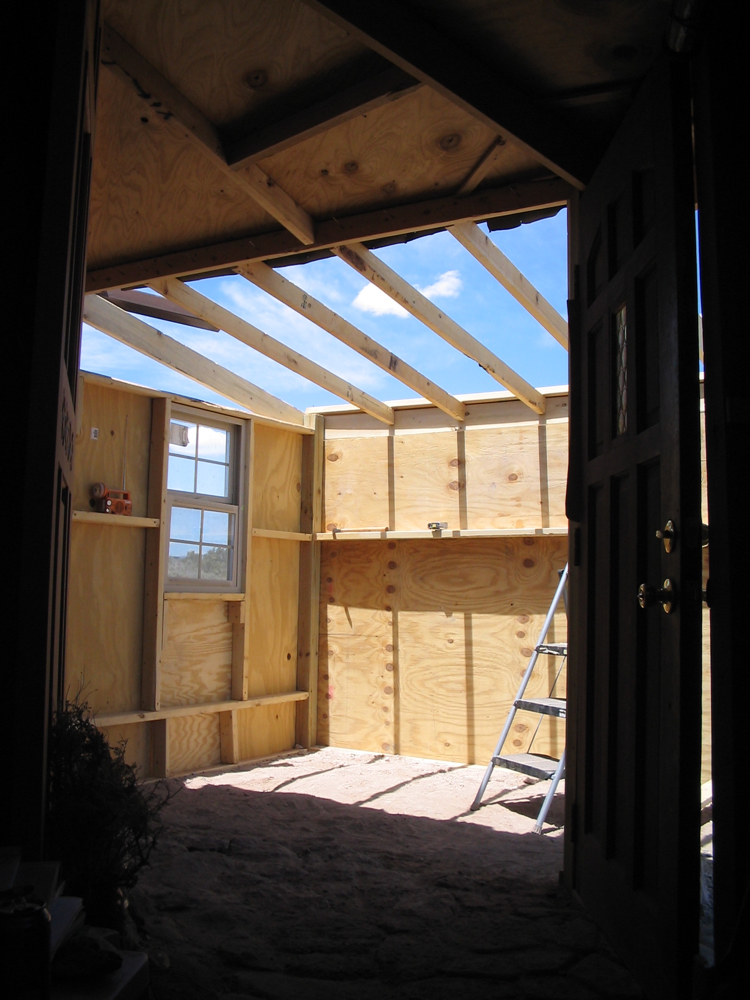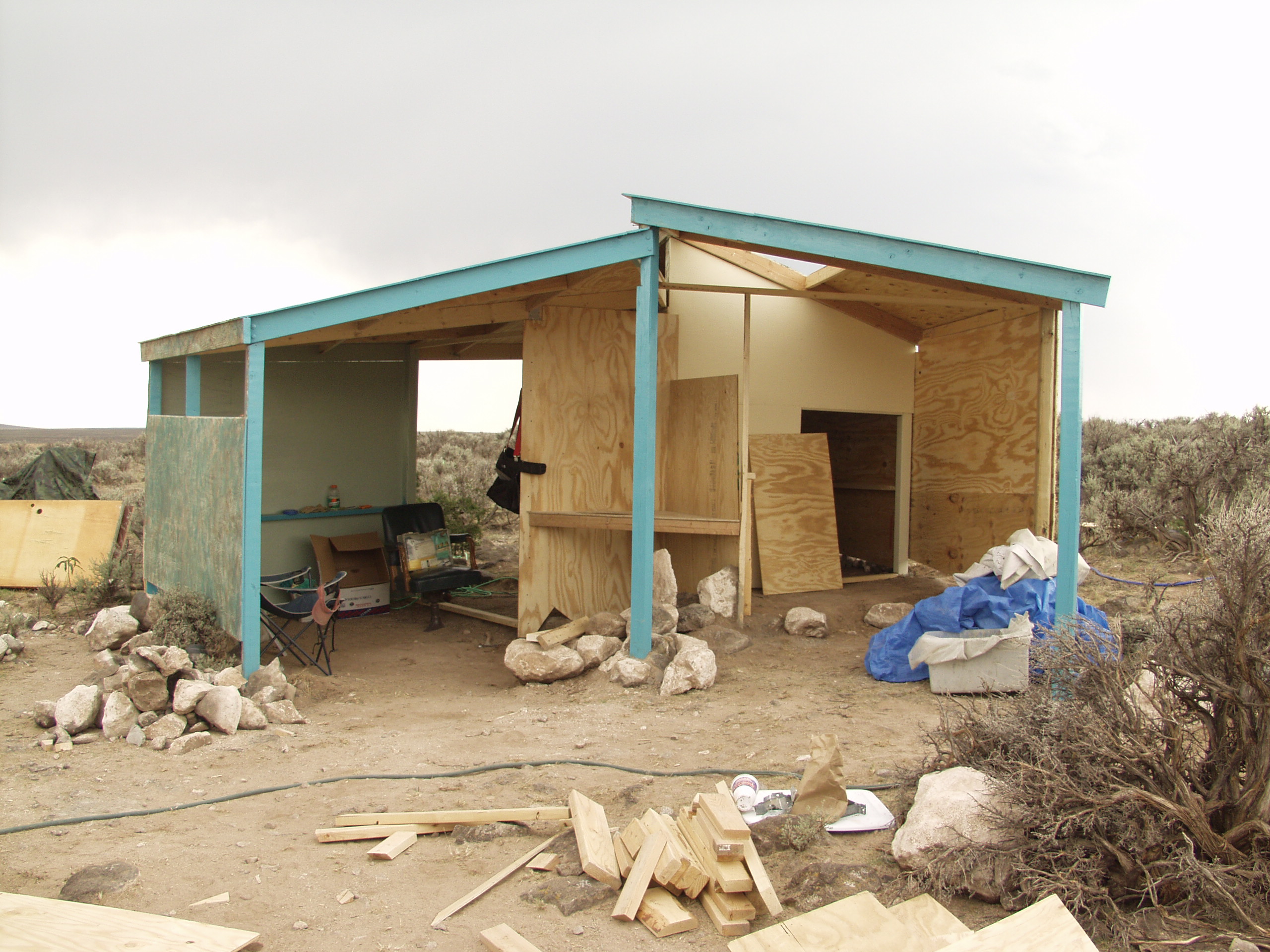 The northeast side of the building was wide open to the elements as the prevailing weather usually came from the southwest. Dirt floors would have to do, although I had plans for something for the shower area. Except for the ½ inch plywood roof, it was less shelter than the burlap booth we had at the Renaissance Faire which only had to last six weeks.