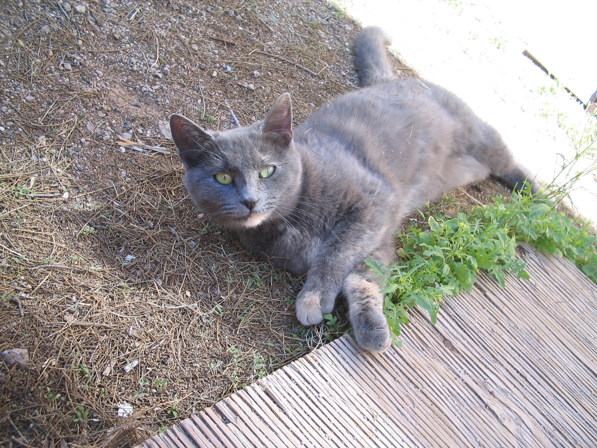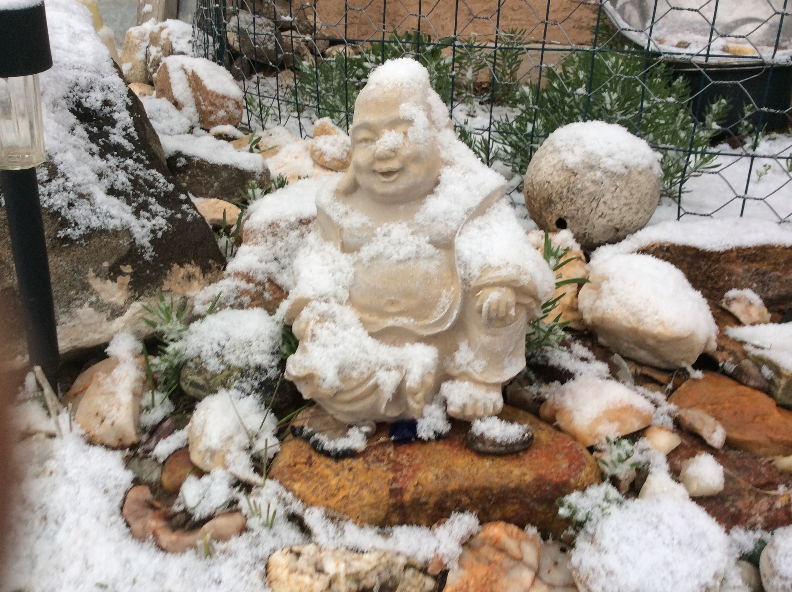 I have also expanded the enclosed area to include a separate front yard where the “sacred circle” is and built a solid, latching gate at the entry, further protecting the yard from marauders and giving the girls some space to play. The fence is four feet tall and made of dark green wire whose narrow mesh is only 2” wide by 3” tall, which I assumed would keep out the ravenous bunnies, until I discovered one in the yard munching my plants. I watched to see where he got in, figuring I had missed a breach someplace, when I watched him wiggle through the mesh of the fence! So then I had to get chicken wire and re-do the whole fence at the base…and they are STILL getting in somehow.