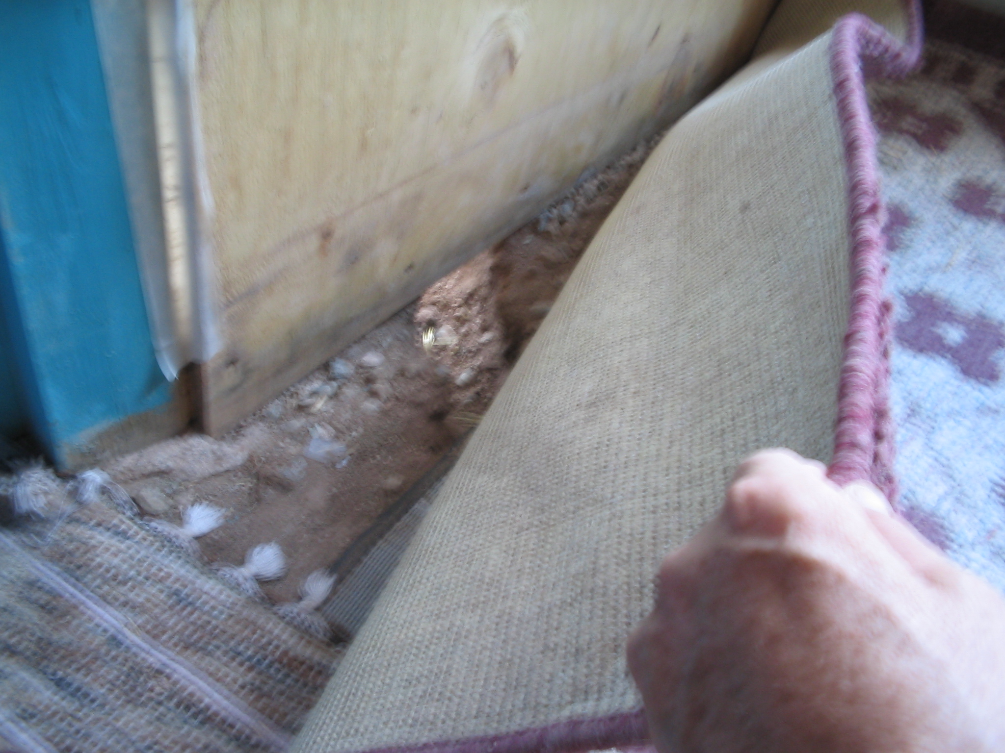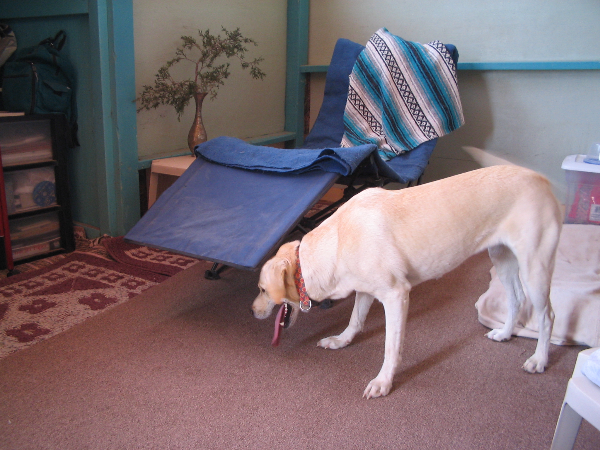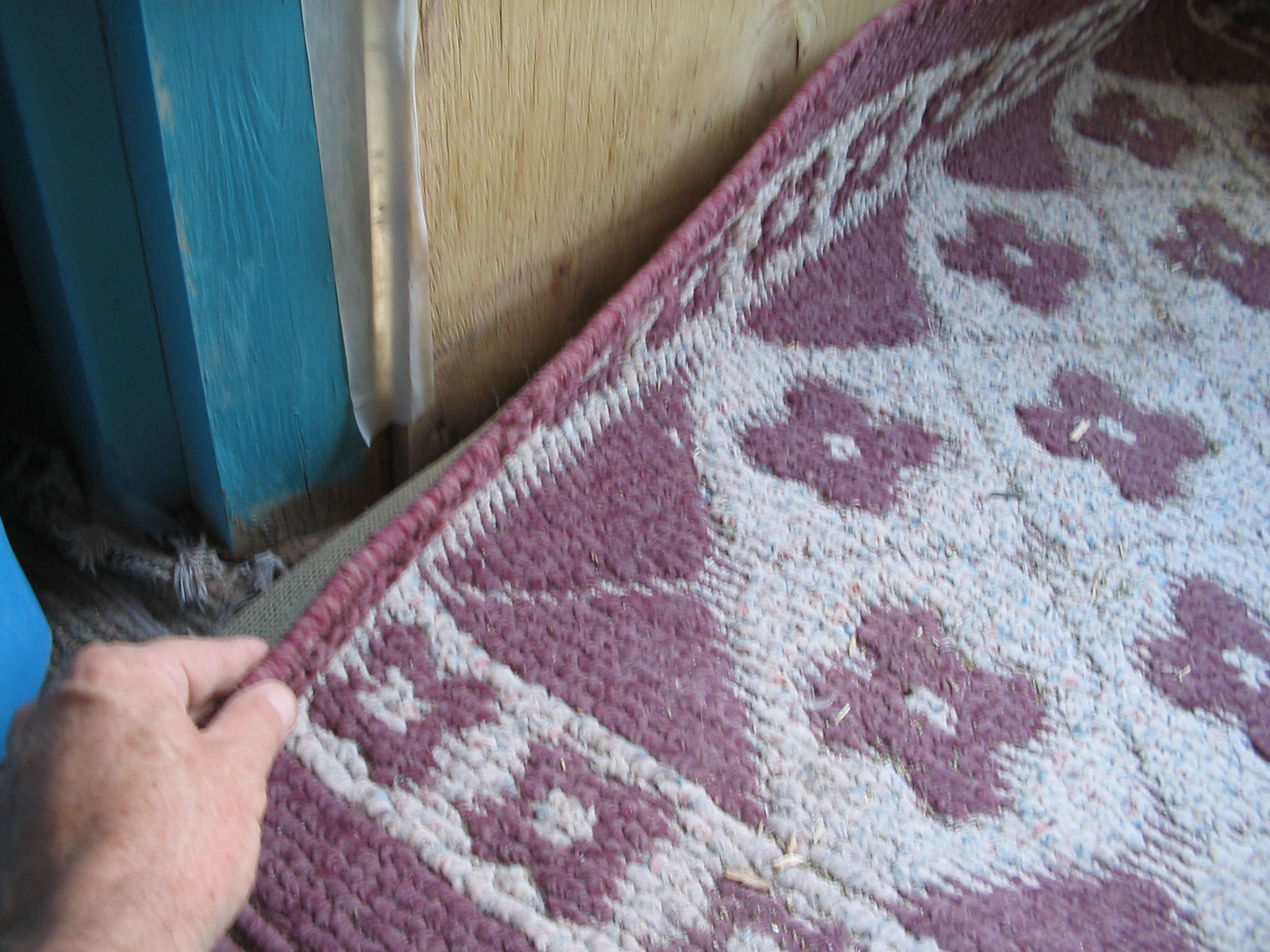 He was intrigued by the yurt and we entered the east facing door through the flap of canvas that tied to the door frame. There were no furnishings except for a folding camp chair, many mouse-proof plastic bins containing clothes and food and such stacked along the walls, and a low futon mattress on a wooden frame jutting into the room from opposite the entrance.