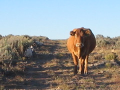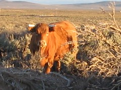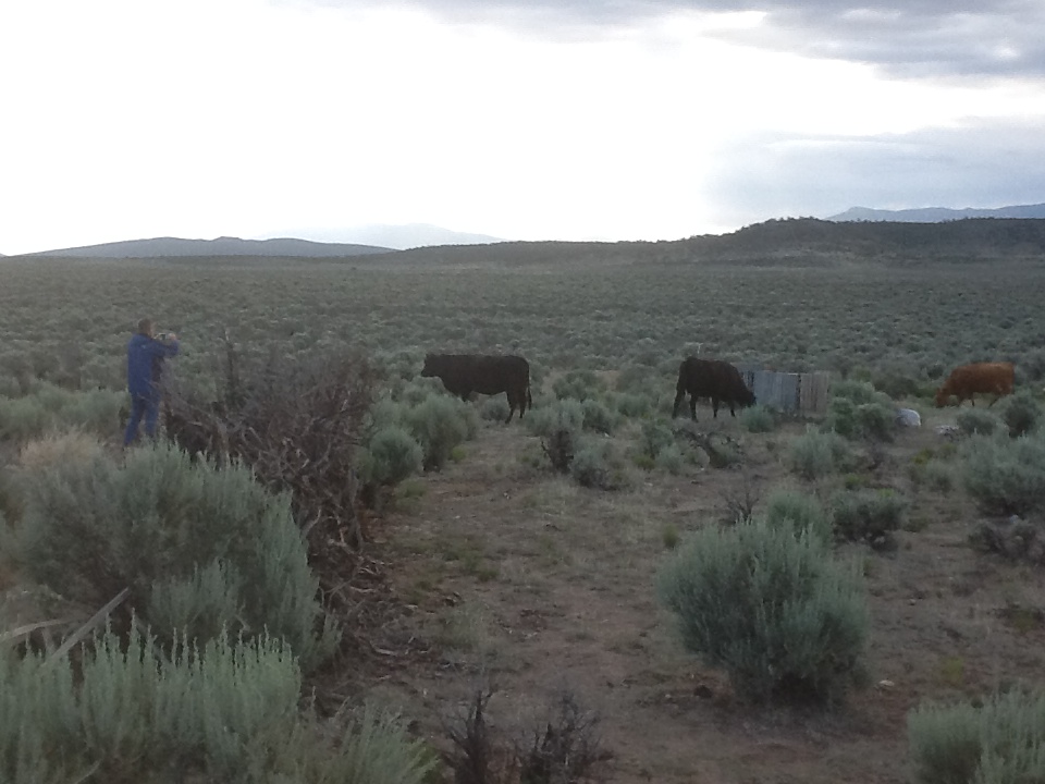 The next time I heard them coming before they got too close and repeated the charge, but they were scattered and didn’t startle en masse as before. The dogs came running, but didn’t bark this time. Still it was enough to get the herd moving away, though more casually this time. My Stunmaster 7 Million gave one burst and then went dead (I still don’t know how many hours it takes to charge seven million volts using my solar panels, but apparently it wasn’t enough.) but the sound was enough to spur them a little more. Then the cheap plastic airhorn top snapped off and it only squealed or croaked after that. The dogs chased them up the hill through the sagebrush but the meandering paths and scattered herd made it more of a saunter, and by the time they got to the neighbor’s house, everybody, dogs included, were grazing. I had to hike most of the way up to the house before the dogs could hear me over the lowing of the cattle. Plus, they were too distracted by the abundant fresh cow plop,…which they found delicious! Ugh!