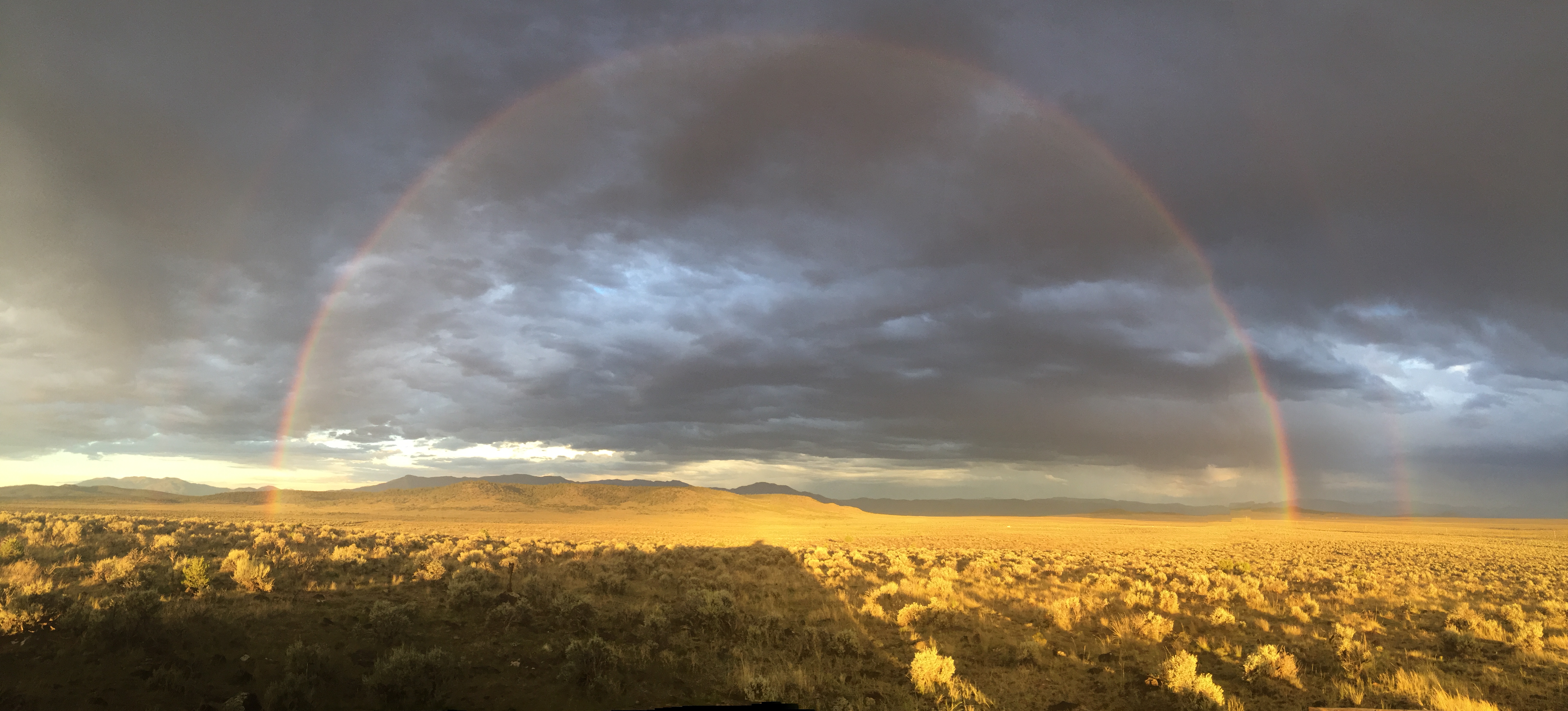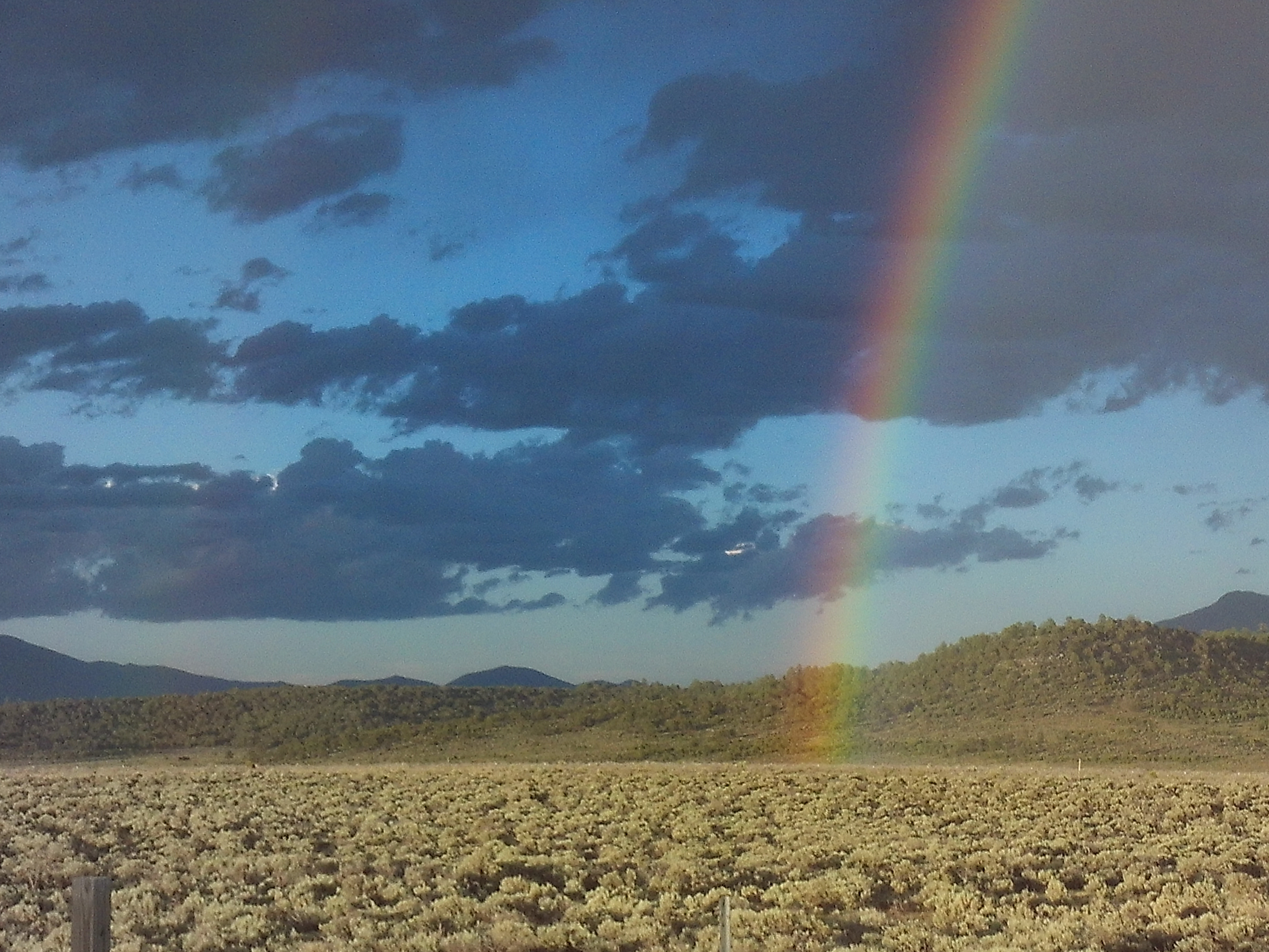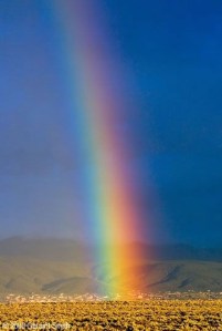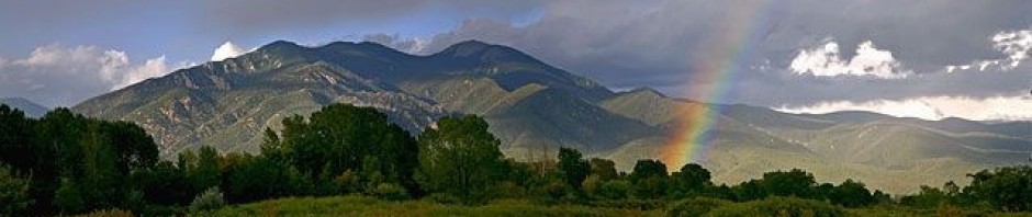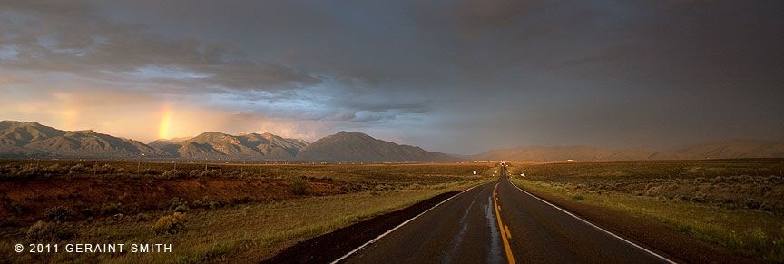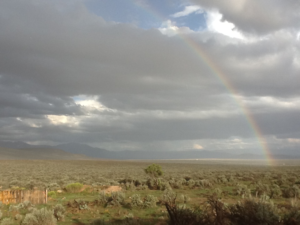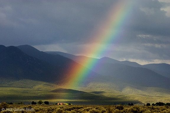 A warm, monsoon thunderstorm had just passed through, casting the valley in dark, shifting shadow. The Sangre de Christo range ran north to my right and there, at the base of Taos sacred mountain, was the town, shimmering white in a golden patch of sunshine, sitting at the end of the most brilliant rainbow!