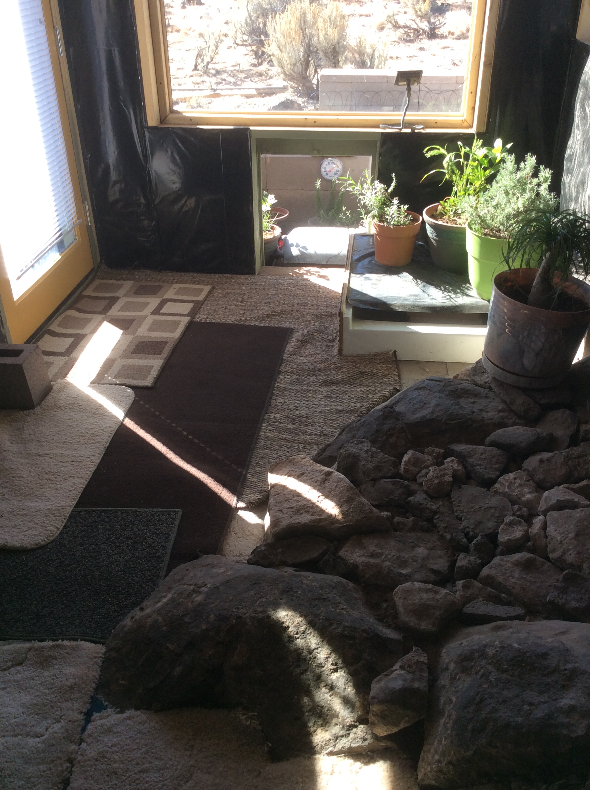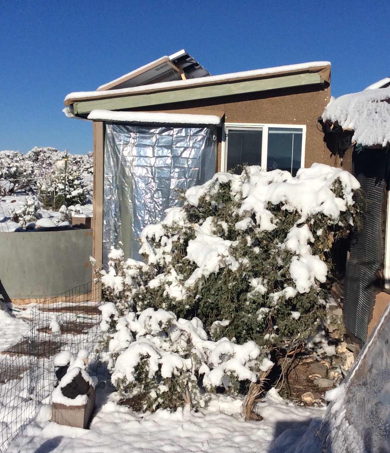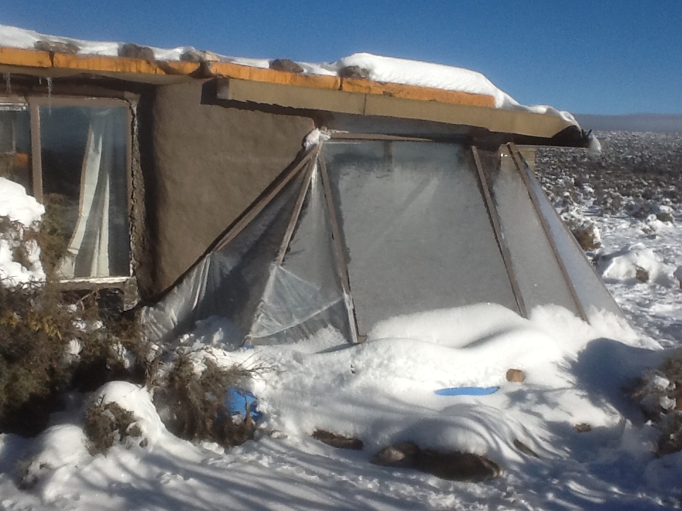 A clear PEVA shower curtain hung over the back door entry (PEVA stays more flexible during sub-freezing temperatures. The vinyl one last year was stiff and brittle.) created a sheltered entry area for both the back door and doggie door, blocking wind and snow accumulation and vastly improving heat retention for the glass door. Insulated mylar sheets over the windows, walipini, and back door made big difference, too. Another improvement from last year was the installation of drains for the kitchen sink and a shower base, eliminating the need to pitch buckets of gray water out the window into the snow.