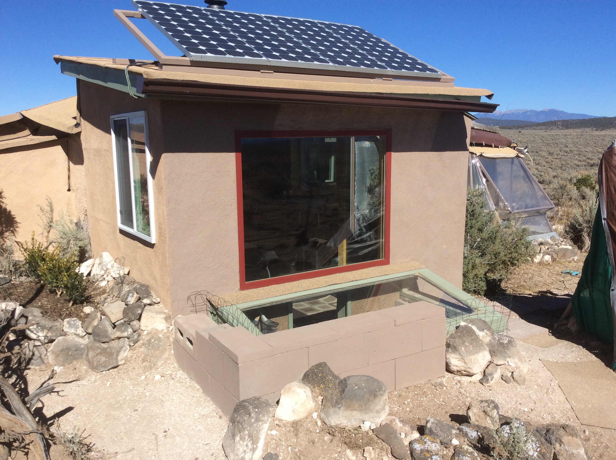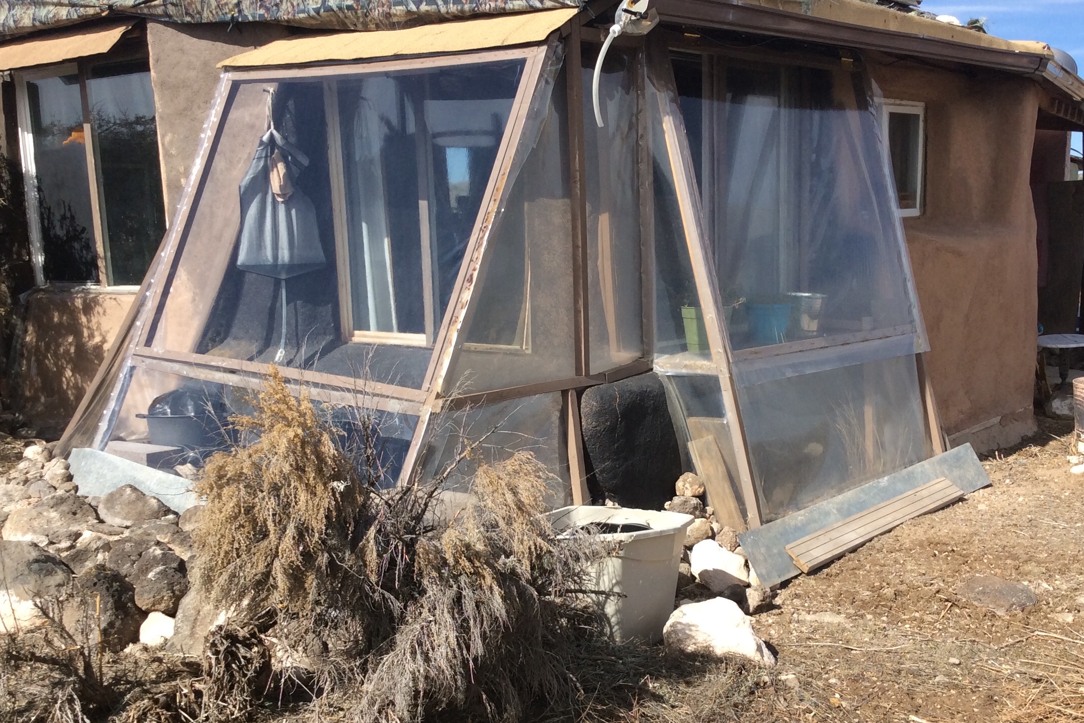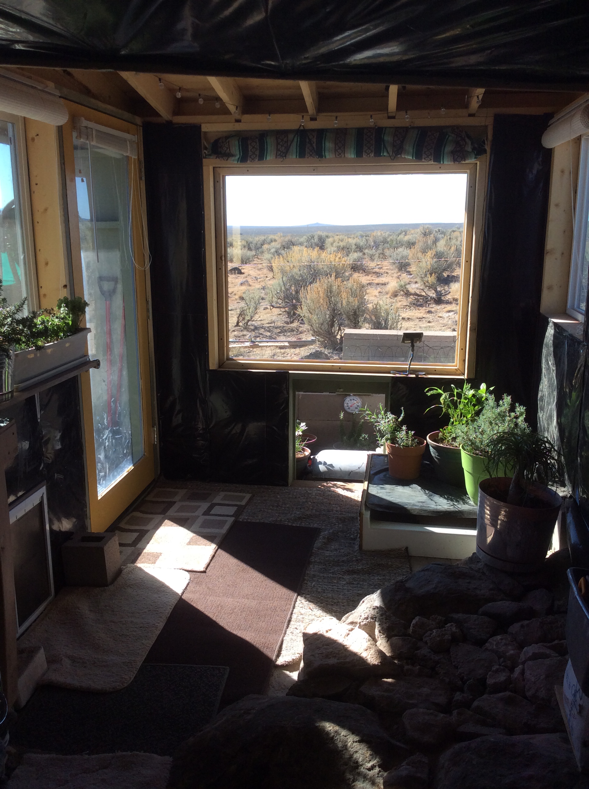 A clear PEVA shower curtain hung over the back door entry (PEVA stays more flexible during sub-freezing temperatures. The vinyl one last year was stiff and brittle.) created a sheltered entry area for both the back door and doggie door, blocking wind and snow accumulation and vastly improving heat retention for the glass door. Insulated mylar sheets over the windows, walipini, and back door made big difference, too. Another improvement from last year was the installation of drains for the kitchen sink and a shower base, eliminating the need to pitch buckets of gray water out the window into the snow.