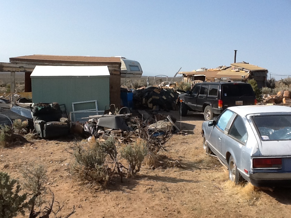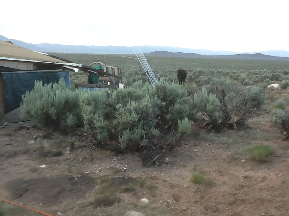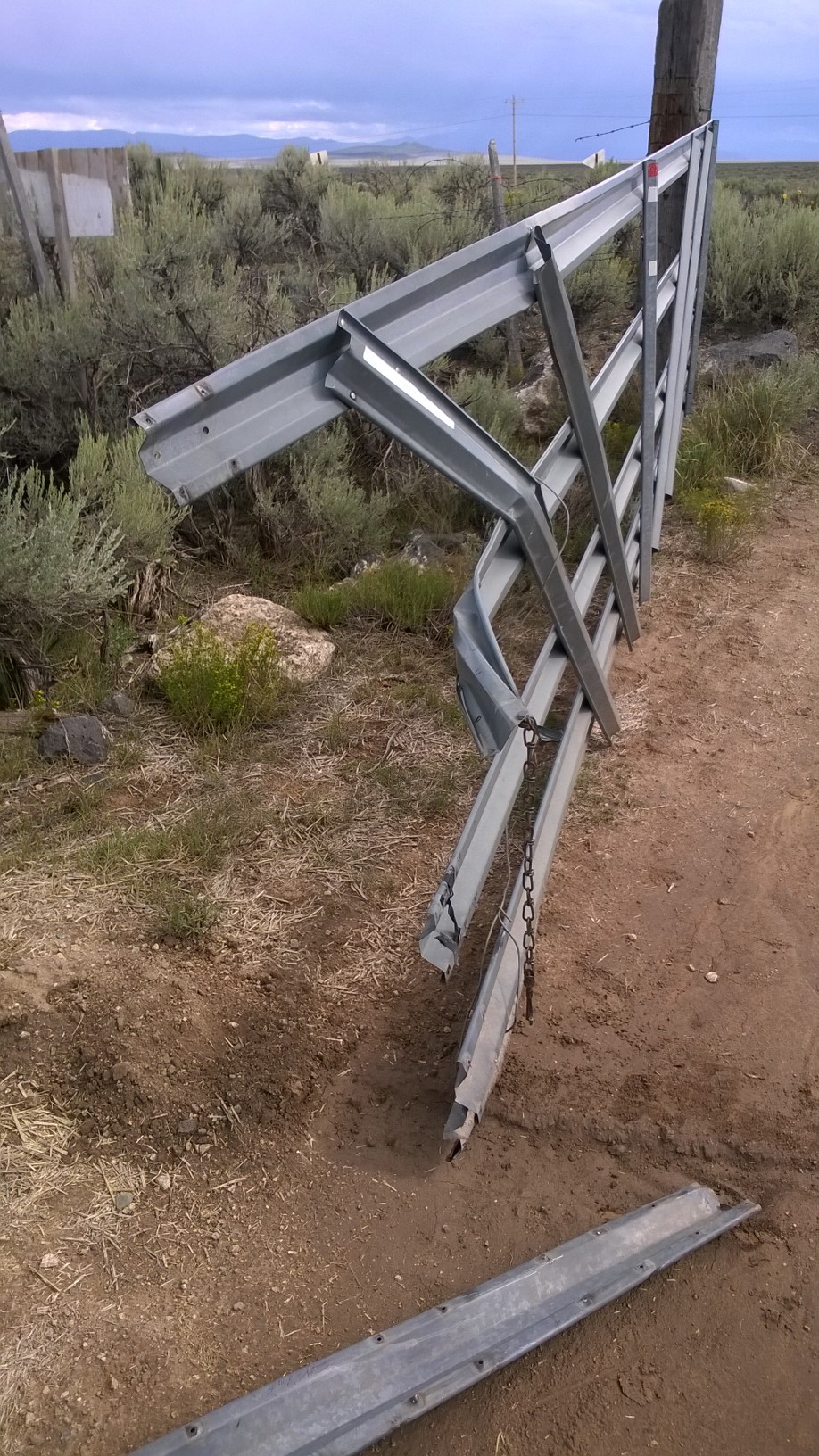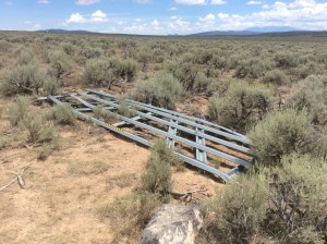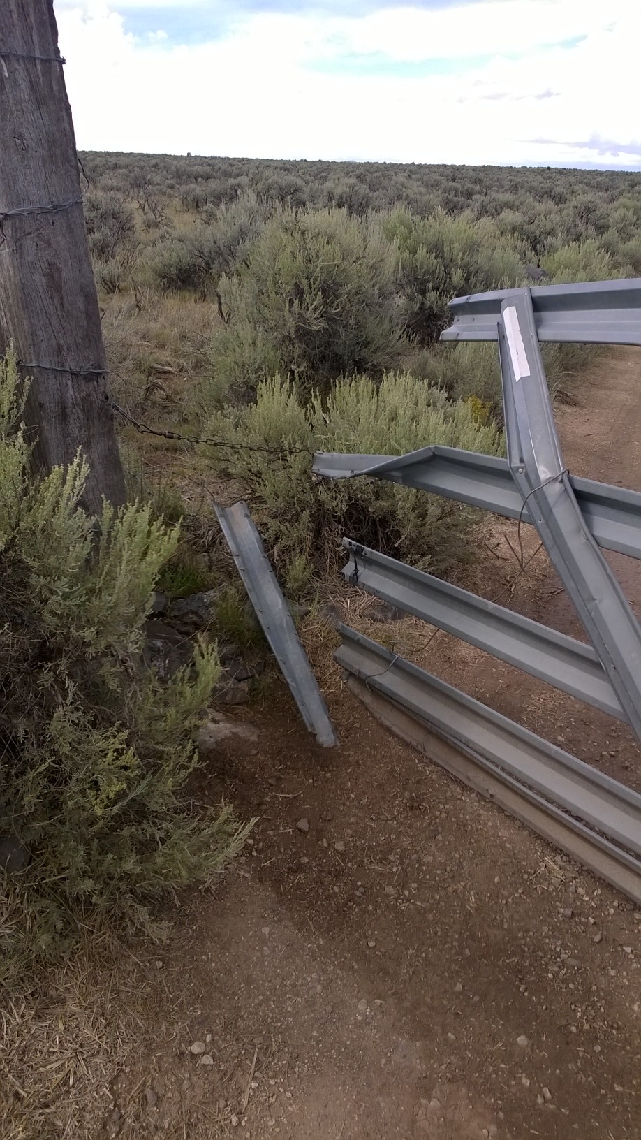 The previous gate, which itself had been an improvement over the floppy barbed wire and post arrangement that was originally there, had been destroyed by a bull last year, trying to get back in off the highway to join the herd. It lies forlorn and abandoned in the sagebrush.