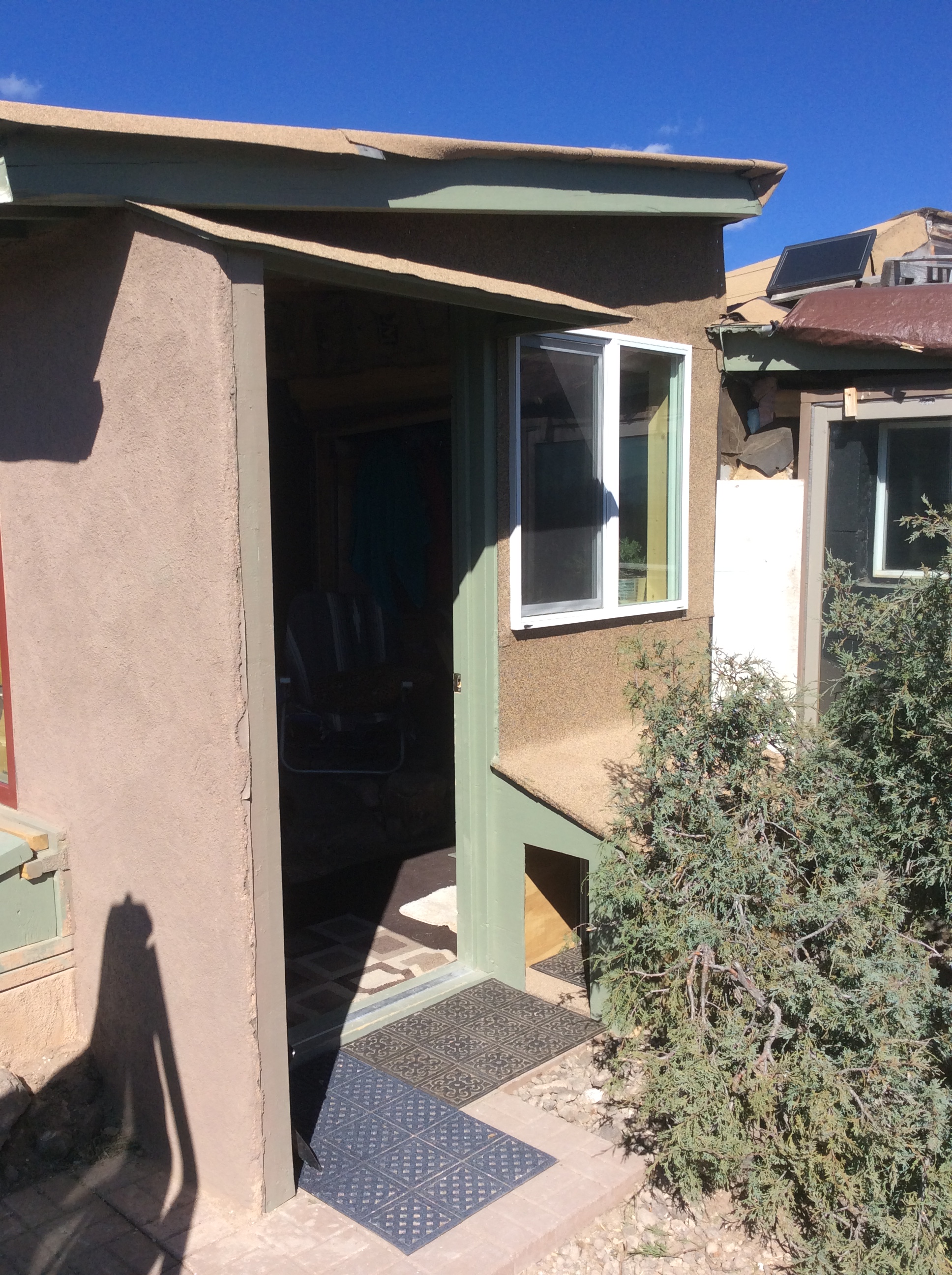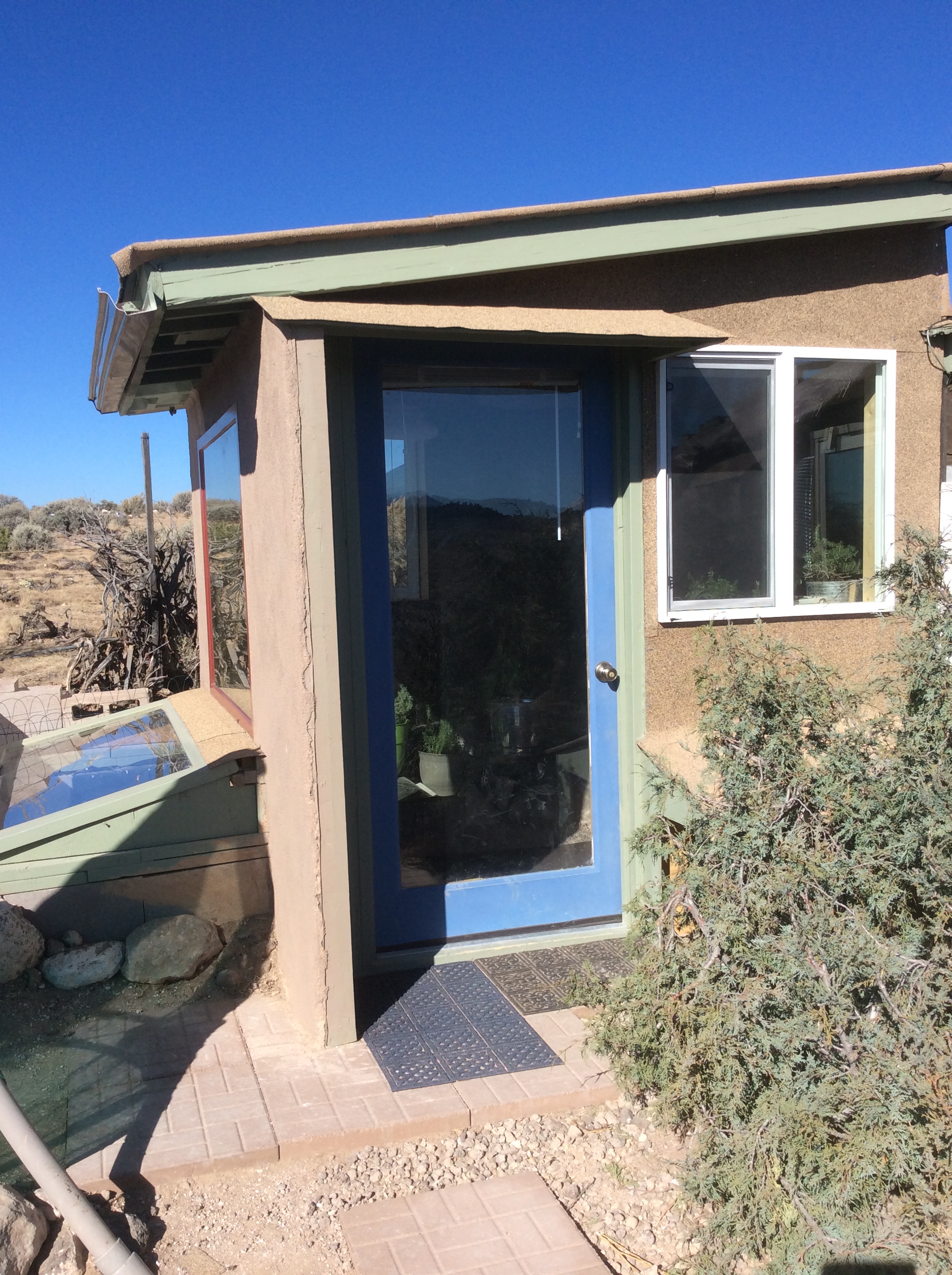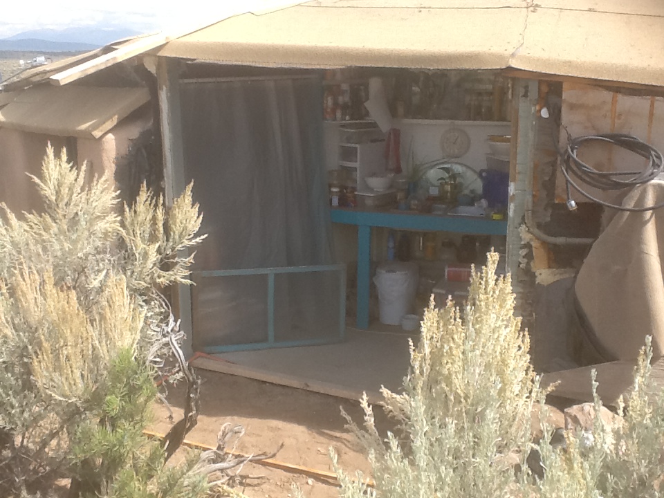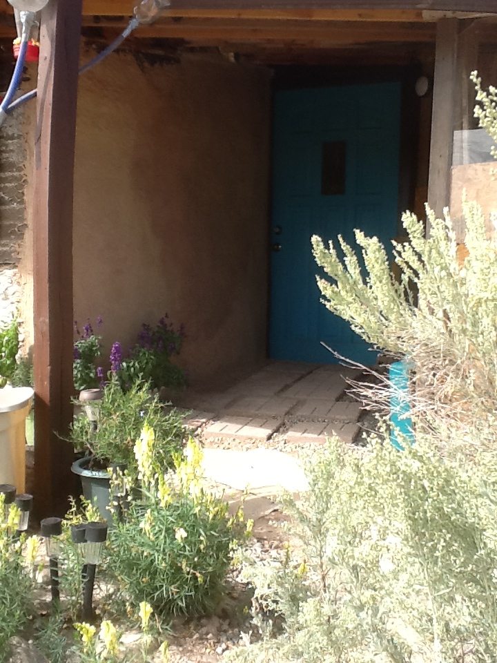 Taos is dubbed “the solar capital of the world” and the local radio station, KTAO, is billed as the world’s most powerful solar radio station. With no electricity yet, I depended on a tiny solar powered emergency radio for my connection to the world and KTAO was the only station I could get. Luckily it reflects Taos’ people and offers an eclectic array of diverse styles and cultures, playing different programs featuring everything from Classical, Country and Native American music to Pop, Reggae and Jazz. (Very like KBear on the TV show Northern Exposure) It has a program called Trash and Treasures where people call in with things for sale and such and one day I heard a guy offer a front door for free! I called him and raced down the canyon to Pilar to get it. It was an old, beat-up thing but it was heavy solid wood, and it was free.