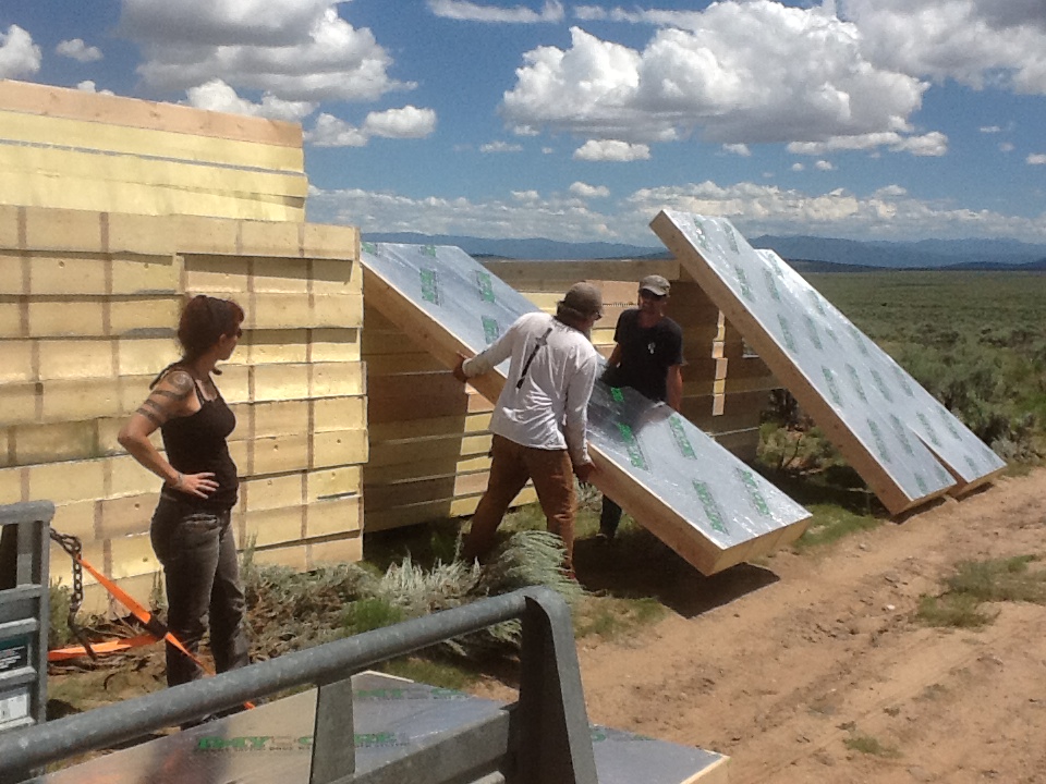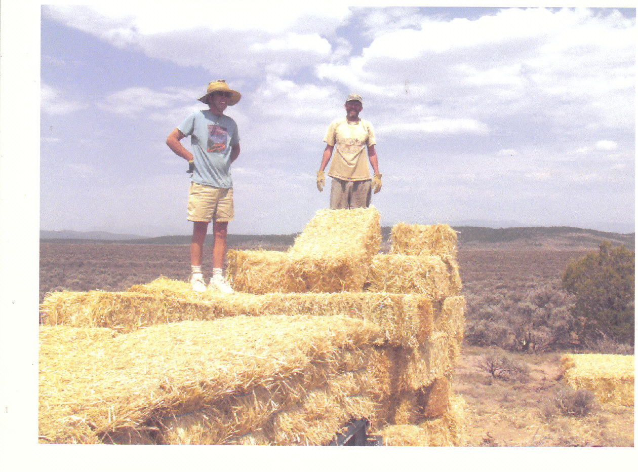 The drought had made local straw bales scarce and had driven up the price so I found a cheaper source in Colorado and hired fellow off-gridder named Chuck who had a big flat bed trailer which he hitched to his old Winnebago and brought down my first hundred bales. I wasn’t sure how many I’d ultimately need, but I figured at least another load. New to the bale thing, at first we tried handing them down from the trailer and stacking them but after a few fumbles, we discovered that they will usually just bounce, if you toss them right.