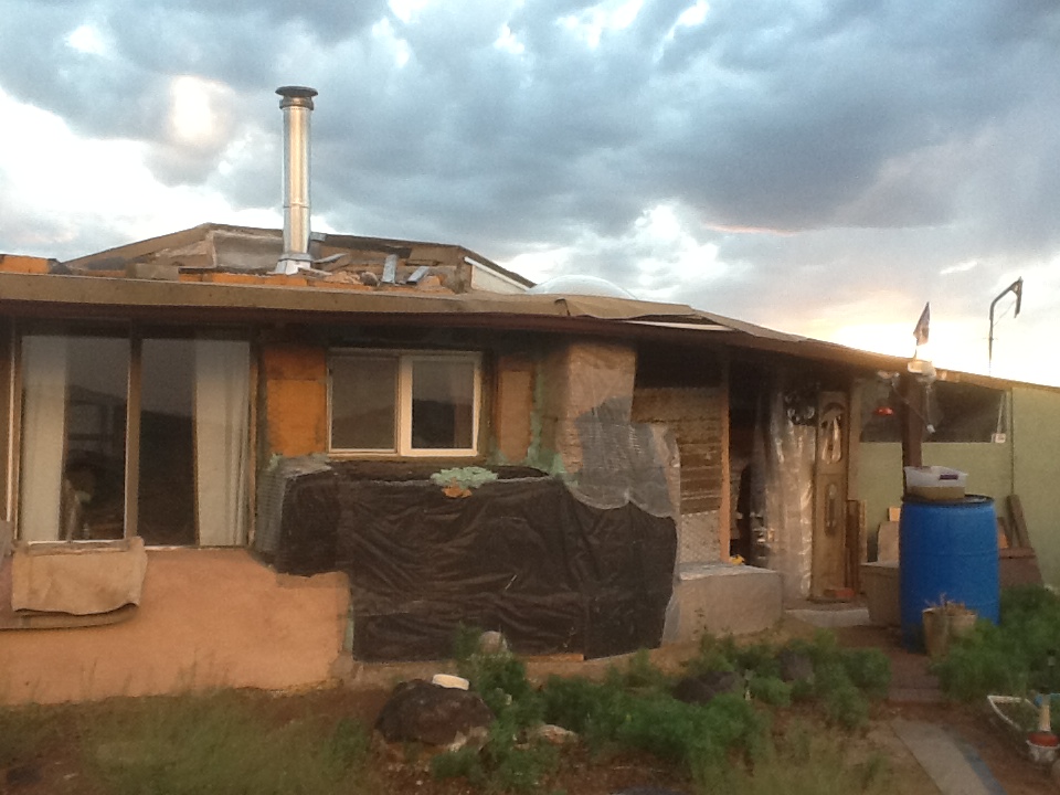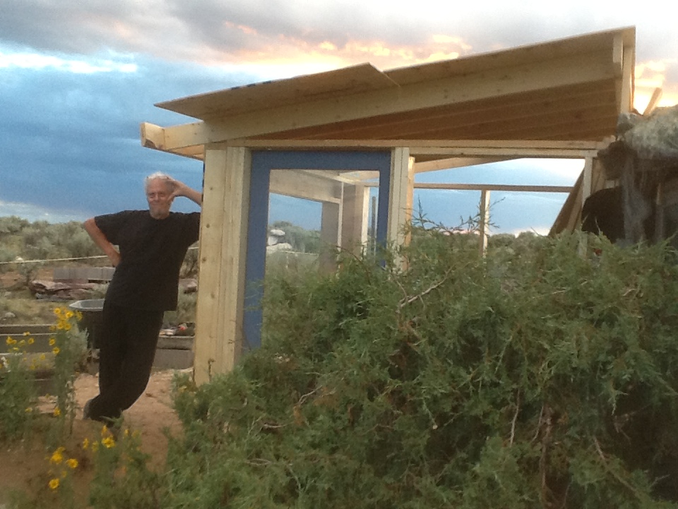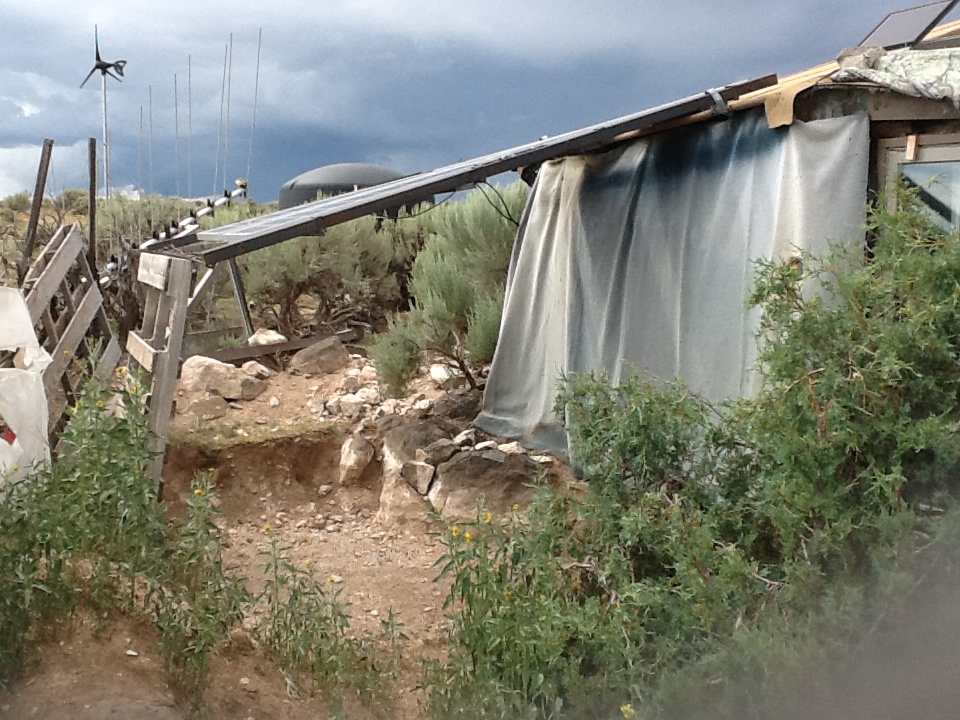 I had decided, after much research into alternative construction methods, that a modest, two room straw bale house would be the best place to start for me, offering the most for my dollar. They are both inexpensive to build and about the best insulation around, an important consideration for a region that is hot in the summer and very cold in the winter. I like their sculptural quality and once stuccoed, they have the appearance of the local adobe construction. Diverse and imaginative architecture is a local hallmark. Taos is the home of Earthships, dwellings earth-bermed to the north with south facing glass walls capturing the winter sun in the thermal mass floors, and roofs which harvest solar energy and rain. Driving across the mesa, one can see a range of Earthships, geodesic domes, straw bales, yurts and various imaginative hybrid structures incorporating non- traditional building materials, such as vehicles, wooden pallets, and other scavenged materials.
