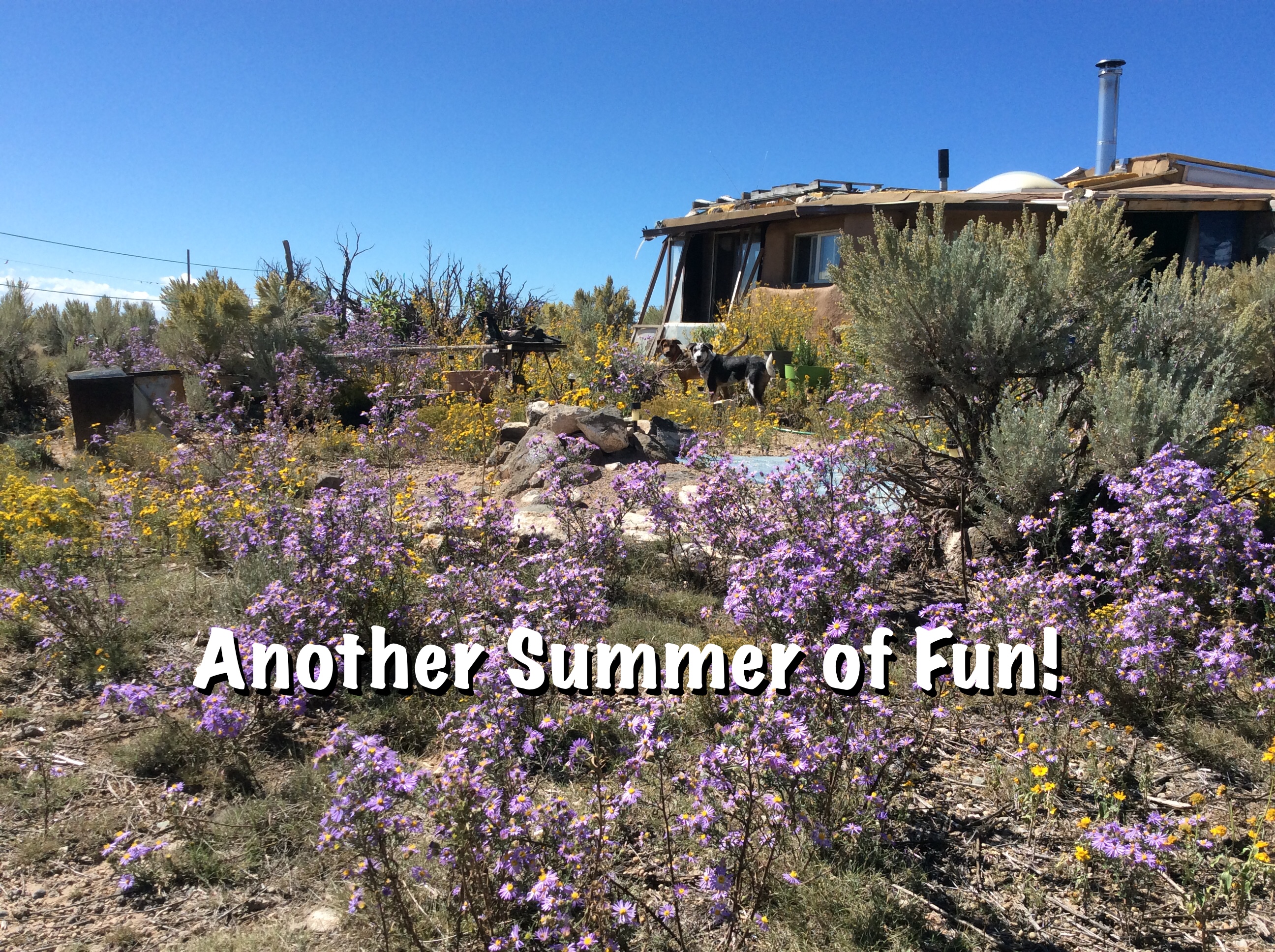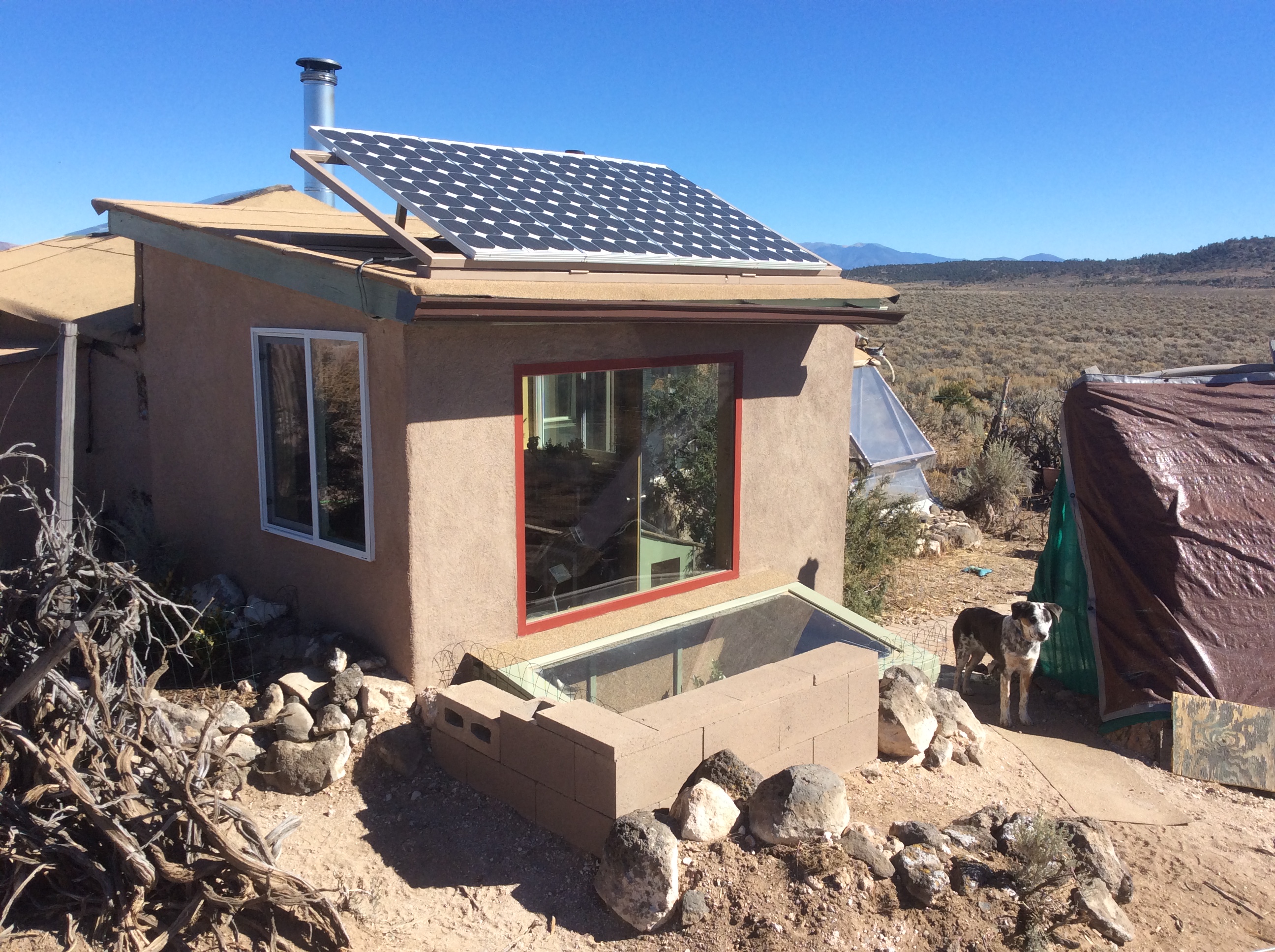 I managed to stay though the whole winter again. (Can’t leave with the puppies now anyway.) The insulation improvements coupled with more refined passive solar got me through on only one cord of wood with a little to spare, even though it got down to fifteen below for awhile at night and only in the twenties in the day. I’ve improved my fire building technique, copying a stacked, bonfire style used by the Pueblos, which vents well for the wood stove, catching fast and burning hot. The two solar windows heat very well during the day, the east one needing less than an hour to provide heat to the whole house. In fact, the system works SO well that the temperatures can often exceed a hundred degrees in there and the plastic flashing pieces that hold the glass in the window frames have now warped and deformed so badly that I will have to replace at least one of them. Live and learn, right?