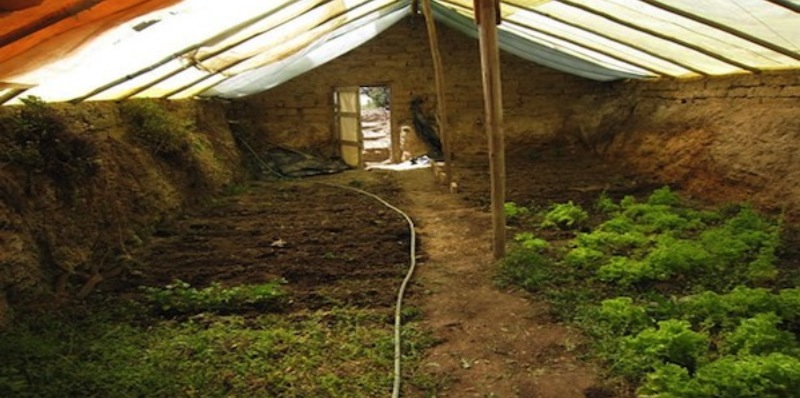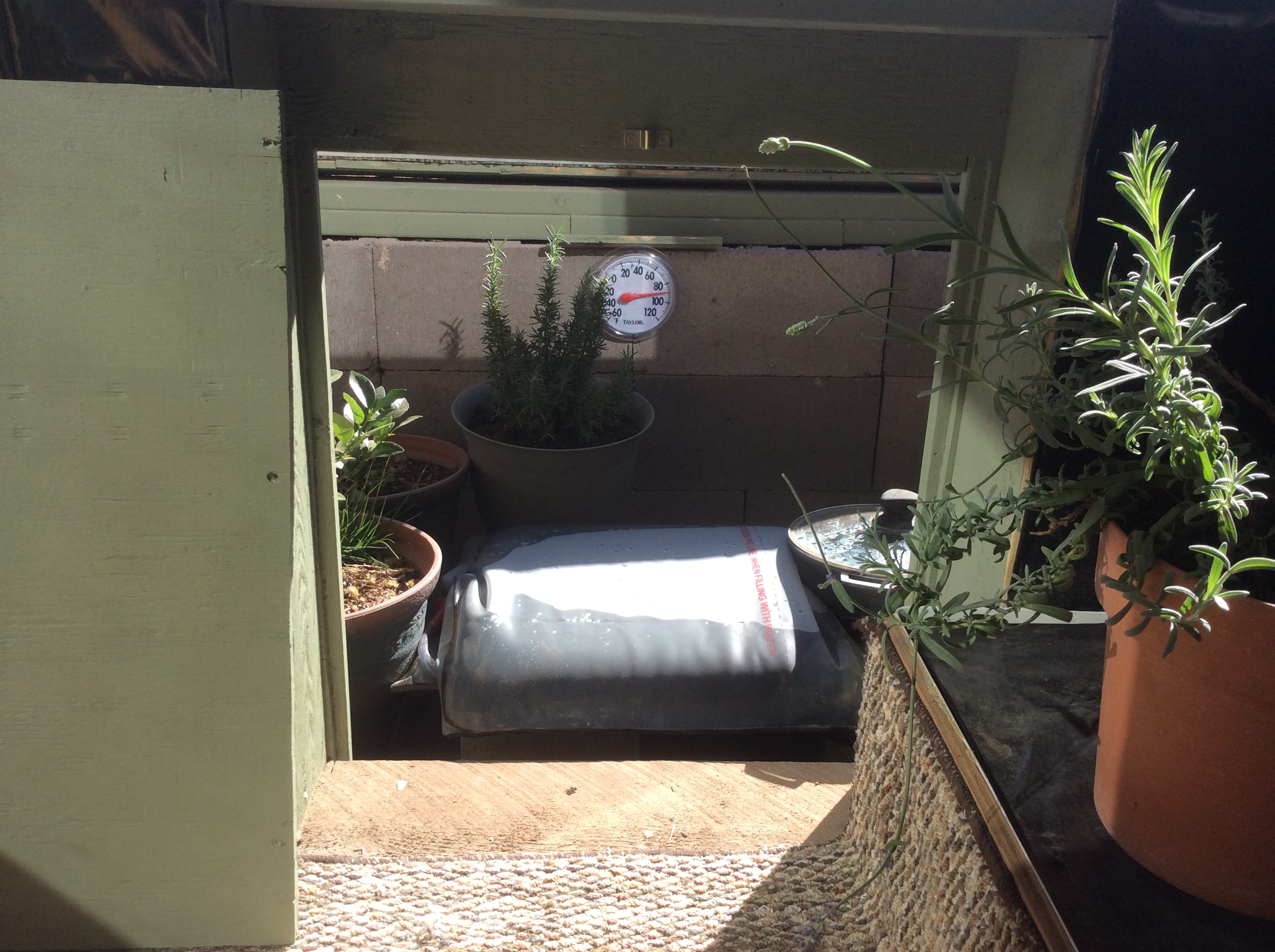 The walipini did, however, also serve well as a solar heater for the new room. Once the thermometer read hot enough, I would just open the access panel and warm air would flood in.
