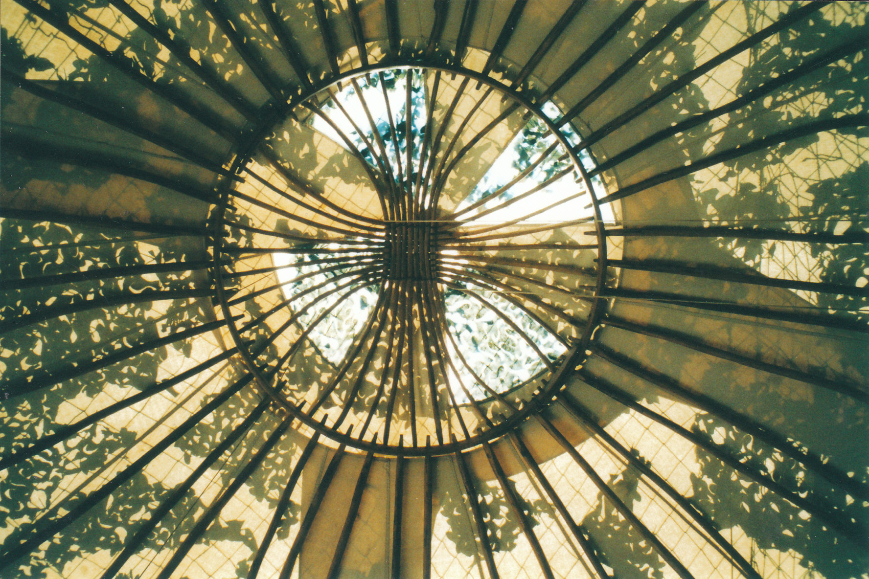 I rented a summer yurt from an acquaintance in town, a bright, white circular canvas tent affair, maybe 18 feet in diameter and 12 feet high at the center, with vertical walls and a shallow, rounded, conical roof.