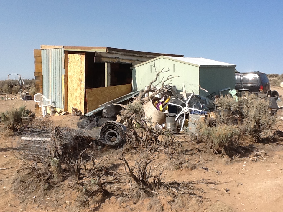 On the way back to town I made the turn in Tres Piedras onto Highway 64 east which takes you across the Rio Grande Gorge Bridge on the way back to Taos. A short way along from the intersection there are a number of small, half and one acre “developments” littered along the way and extending back into the low hills in places. They were mostly decrepit mobile homes and various bodged together shacks with a scattering of derelict cars, outhouses, weathered hippie school buses and junkyards creating the sense of a shanty town intruding on the otherwise uninterrupted blanket of sacred sagebrush stretching to the distant horizon. I shuddered at the unkempt quality of the area and shut down my “feelers” as I hurried past. (karma alert-“judge not…”)