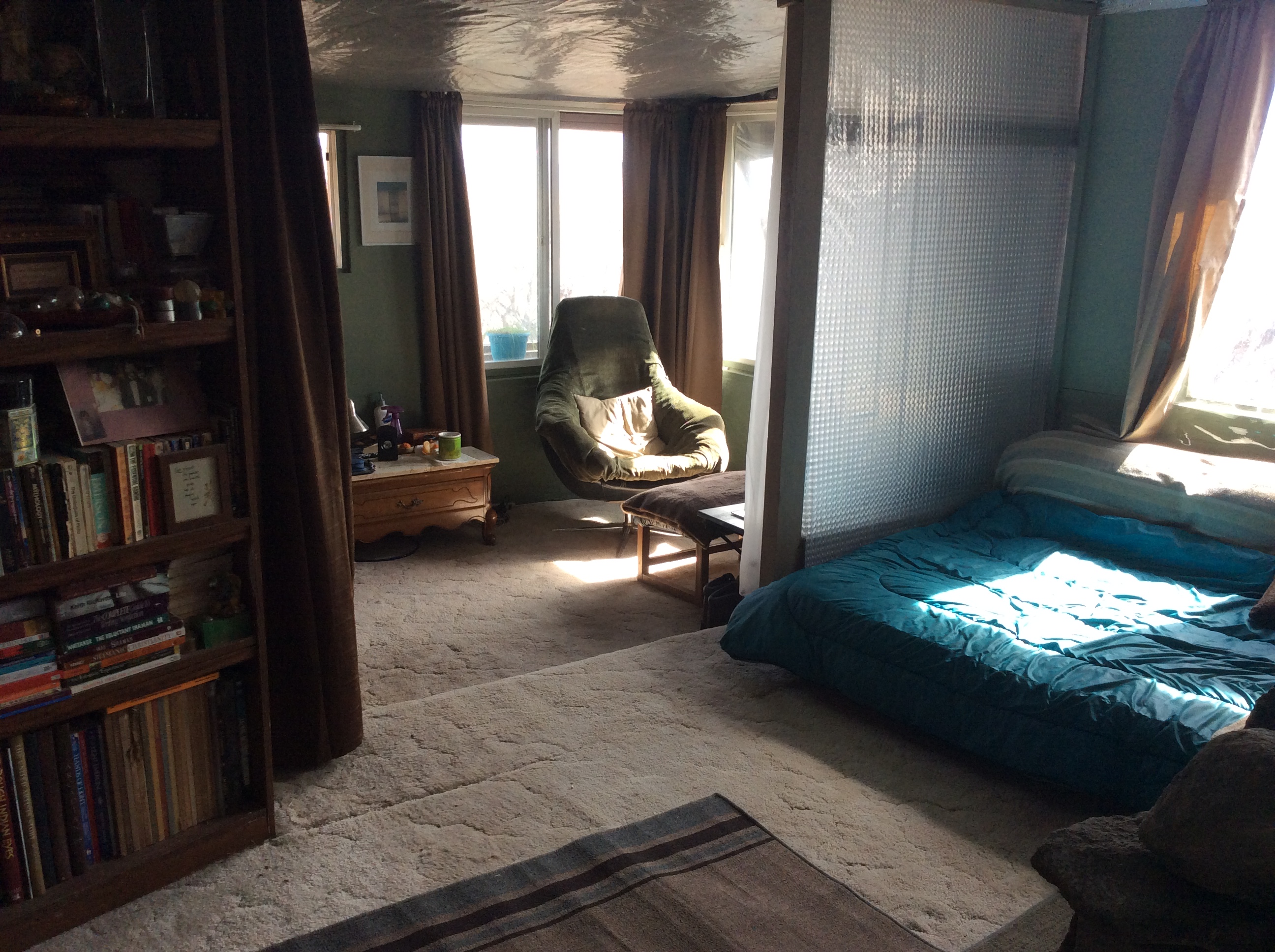 Improved window coverings for night, including the same mylar “bubble wrap” sheets I have affixed to the ceiling, serve well to keep in the solar gain from the day and masonry around the stove maintains steady warmth through the night, making midnight stoking unnecessary. For the chilly times, such as gray mornings, rather than start a fire, I use the propane space heater and close off in the east room where the TV and comfy chair are.