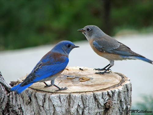 As I reached in, I was startled and horrified to see a three foot, golden brown snake as thick as my wrist, coiled up on the ledge at the nest with a baby bluebird in its mouth! Shocked, I nestled the weak bird in my hands in some weeds growing from a large flower pot and turned back to the scene. At that moment another chick came tumbling out of the nest. All the while, both parent birds were flying around in a frenzy, and raising a ruckus. The second chick was stronger and resisted being caught and placed in the pot with its sibling and immediately jumped out.